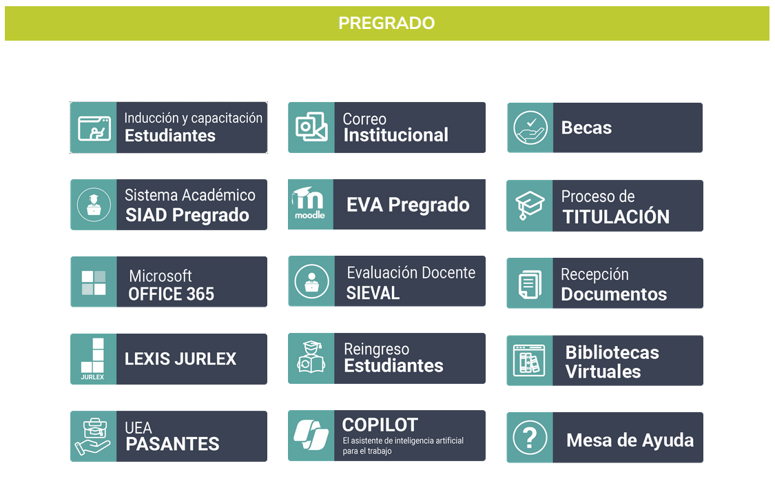 Como estudiante de PREGRADO usted usará los siguientes sistemas y/o plataformas, que se encuentran disponibles en la página institucional www.uea.edu.ec opción “Servicios universitarios”.
